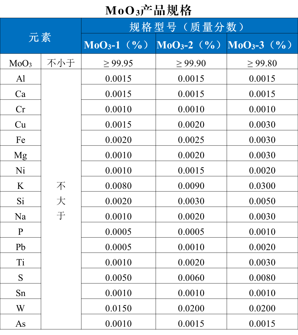 產(chǎn)品根據(jù)化學(xué)成分和用途不同,分為MoO3-1,MoO3-2,MoO3-3三個(gè)牌號(hào)。